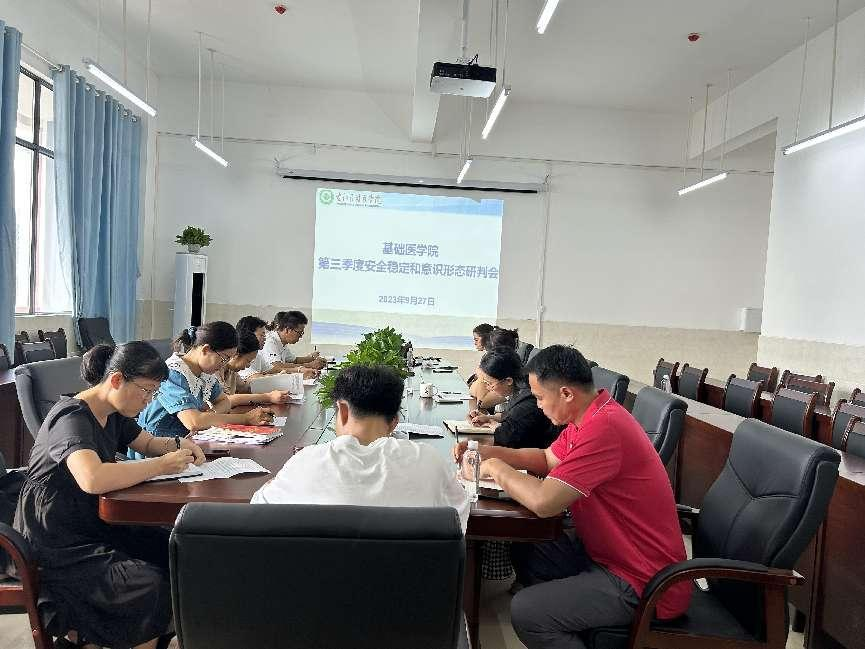 最后,宾晓芸书记作总结讲话,她指出,意识形态工作是党的一项极端重要的工作,必须引起高度重视,密切关注意识形态领域风险问题。一要提高政治站位,始终保持高度警惕、做到头脑清醒,切实主动扛起意识形态工作的政治责任,将学院意识形态工作的领导权、管理权、话语权牢牢掌握在手中;二要强化思想引领,坚持不懈用习近平新时代中国特色社会主义思想和党的二十大精神铸魂育人;三要加强阵地管理,严格落实意识形态工作责任制。在“双节”来临之际,要做好各项工作安全排查,关注重点人群,关注学生动态,关注师生中秋节、国庆节期间外出去向,主动发现问题解决问题,防范化解各类安全风险。加强引导教育,提高师生防网络电信诈骗,防宗教渗透意识,做好师生出行安全、防溺水宣传教育工作,提高师生的安全意识,保障师生人身财产安全,守好廉洁阵地。