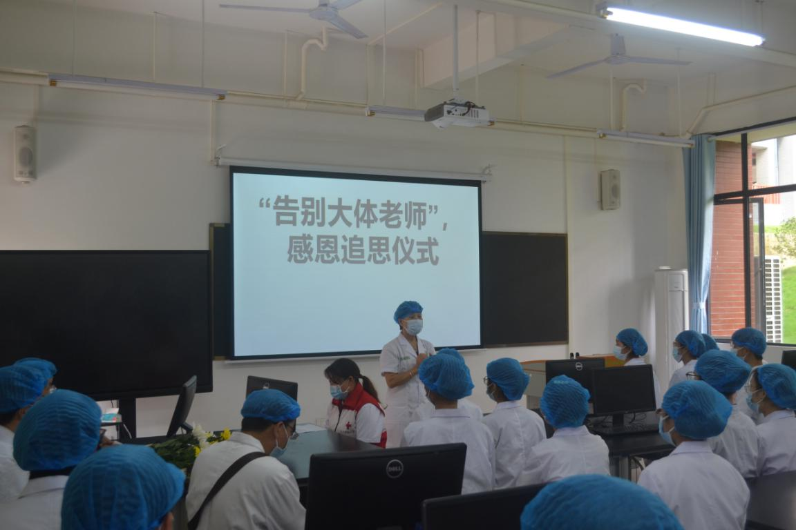 感恩追思仪式由黄秀峰教授主持,百色市红十字会的黄伟勤同志介绍了“大体老师”那苏同志的简要生平,分享了那老师自愿捐献器官、捐献遗体的故事和他感人肺腑的临终遗言。遗言中提到:“我志愿将自己的遗体和眼角膜无条件的奉献给医学科学事业,为祖国医学教育事业和提高疾病防治水平,让在黑暗中行走的眼疾患者重见光明,用平凡生命最后的闪光把人间照亮。” 这份无私的奉献精神深深触动了在场的每位参与者。宾晓芸教授对大体老师的离世表示沉痛的悼念,对大体老师无私奉献、为医疗事业毅然捐献遗体的壮举表示崇高的敬意,她鼓励同学们要继承“大体老师”的遗志,秉承学校的“大医精诚”校训,珍惜难得的学习机会和宝贵时光,并希望同学们认真努力学习解剖学知识,为今后成为一名医德高尚,技术精湛,“下得去、用得上、留得住”的人间大医打好坚实的医学基础,为祖国医学事业发展作出更大的贡献。