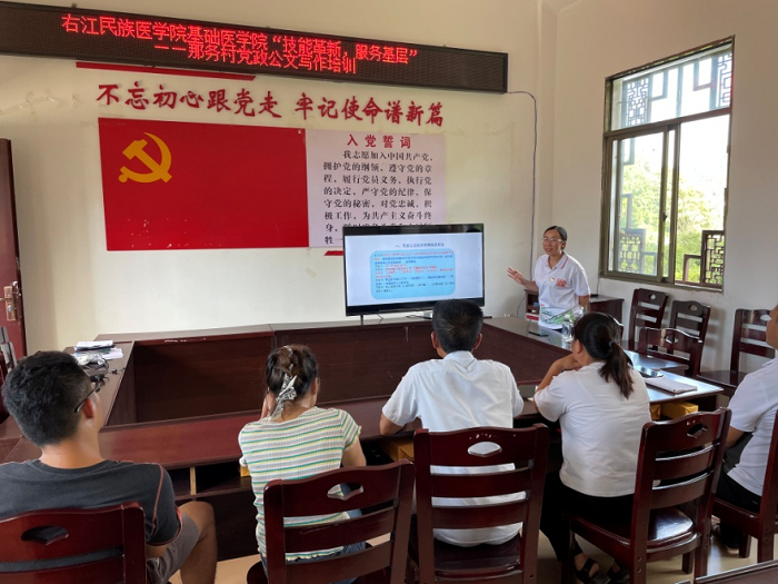 7月12日下午,班主任卢荣妹老师在那务村村部开展技能革新暨党政公文写作培训