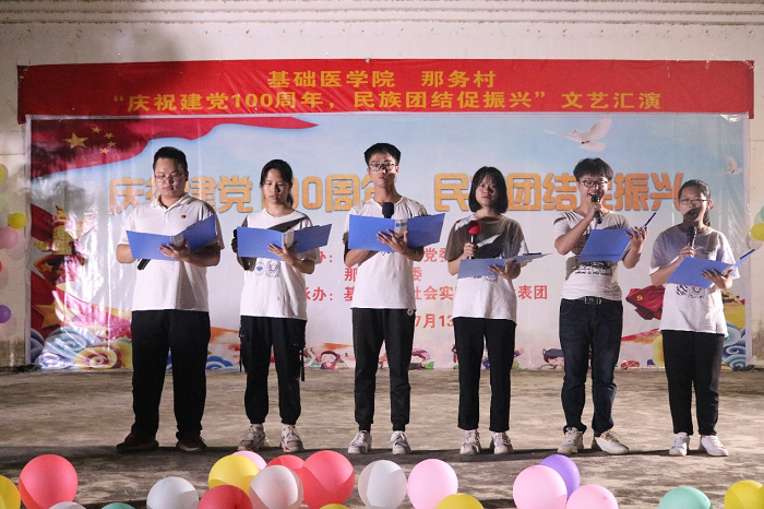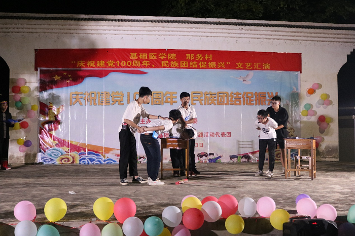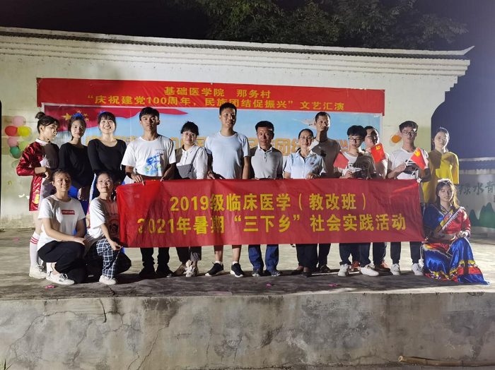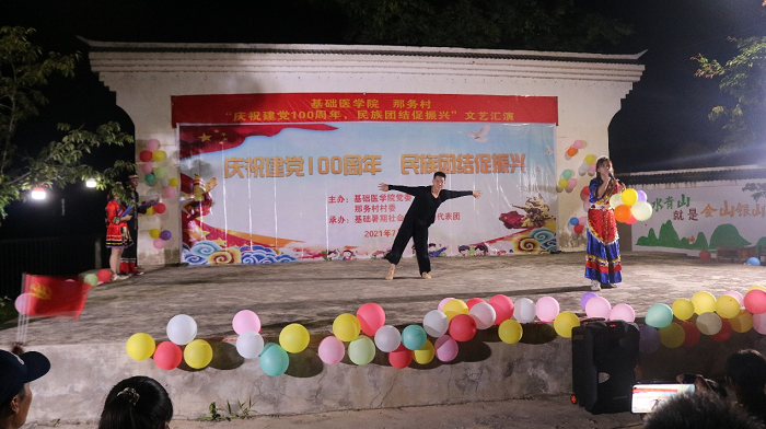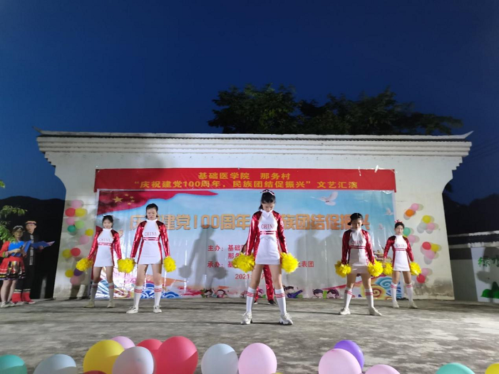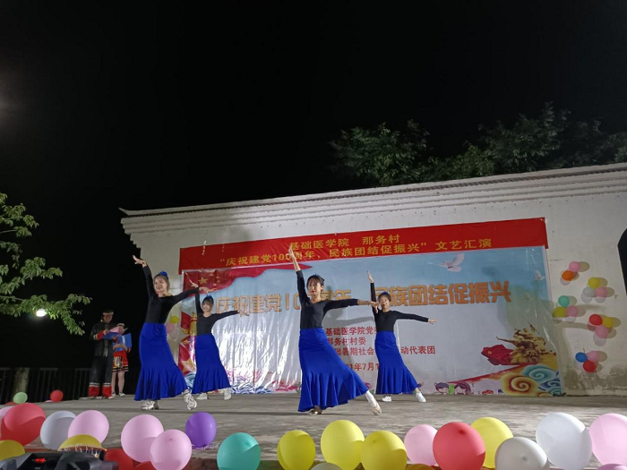 7月13日晚上,2019级临床医学(教改班)有啦啦操《走进新时代》、民族舞蹈《彩云之南》、民歌演唱《高原蓝》、诗歌朗诵《少年中国说》、小品《保健,我们是专业的》等七个节目参加英国上市公司365、那务村举办的“庆祝建党百周年,民族团结促振兴”主题文艺晚会。