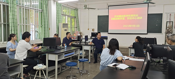 黄衍强院长认真走访各教研室、实验室,听取各教研室、实验室负责人关于运行情况、师资队伍、仪器设施、教学科研及科室发展瓶颈问题的汇报,与教研室、实验室老师围绕教学科研分流轮换、绩效考核、基础医学公共平台建设、百东新区建设等问题开展了座谈交流。